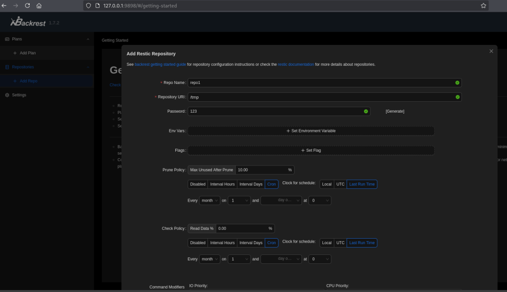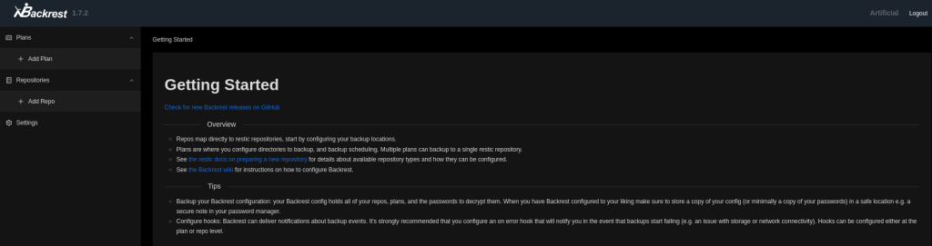 Y ahora si probamos a introducir el usuario «backrest_root» y la contraseña «!@#$%^» , efectivamente accedemos a un panel de administración o dashbaord: