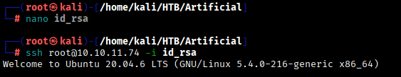 hasta que me genera esa clave rsa privada que me la copio, me la llevo como un fichero nuevo por nano id_rsa , y luego ejecuto ssh como root usando ese fichero creado en el directorio de mi Kali bajo la ruta de la máquina: