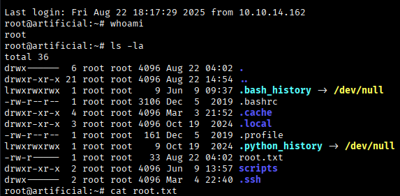 La máquina Artificial comienza con una página web que permite registrarse y subir modelos de inteligencia artificial en formato .h5. Aprovechamos una vulnerabilidad en la carga de estos archivos RCE para subir un modelo malicioso que, al ser procesado por el servidor, nos otorgó una consola básica (shell) dentro del sistema con los permisos del usuario de la web. Explorando el sistema, localizamos una base de datos interna que almacenaba usuarios y contraseñas cifradas; al crackearlas, conseguimos acceder como un usuario con más privilegios llamado gael.A continuación, descubrimos que gael pertenecía al grupo sysadm, lo que le permitía leer ciertos archivos de backup creados por el sistema. Analizando los backups, encontramos configuraciones y credenciales de un panel de administración llamado Backrest, al que pudimos acceder tras descifrar su contraseña de administrador. Desde este panel, ejecutamos una copia de seguridad específica de la carpeta secreta de root ( /root/.ssh/), consiguiendo así la clave privada SSH de root.Finalmente, copiamos esa clave privada a nuestra máquina, ajustamos los permisos y nos conectamos por SSH como root, obteniendo acceso total al sistema. Ya como administradores, solo nos quedó leer la flag final de root para completar la máquina. |