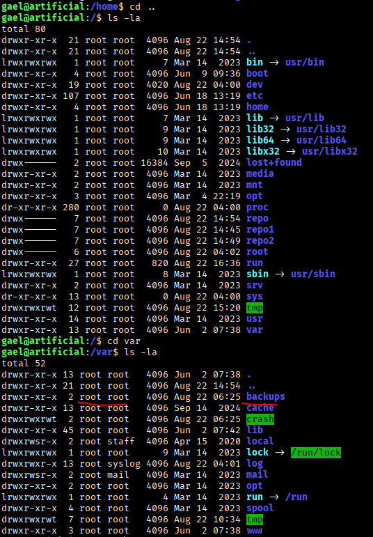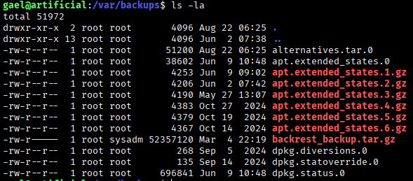 Si seguimos conectados como el usuario gael y navegamos hasta la raiz, vemos un directorio var y dentro un backups con ficheros gz a los que tenemos permiso de lectura porque el usuario gael es sysadmin pero no puedo abrirlos, por lo que los descargaré a mi Kali…