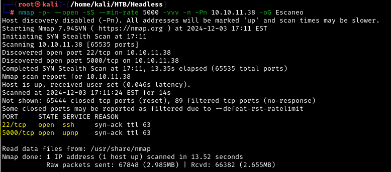 sudo nmap -p- --open -sS --min-rate 5000 -vvv -n -Pn 10.10.11.38 -oG Escaneo