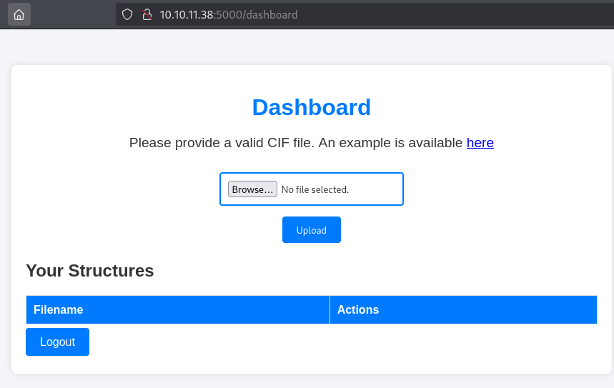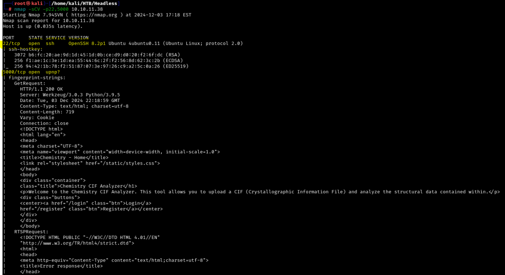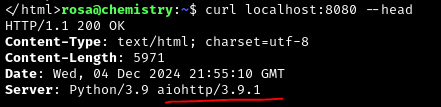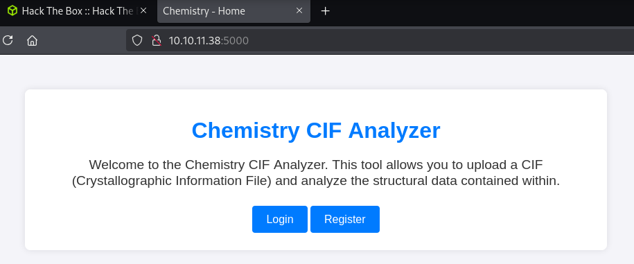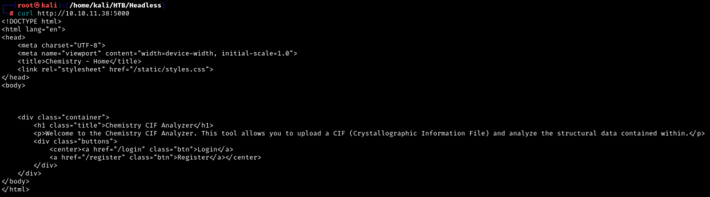 Si aplicamos un curl a esa IP y puerto podemos ver la respuesta en consola donde nos reporta una página en html donde parece haber una aplicación llamada Chemistry CIF Analyzer.