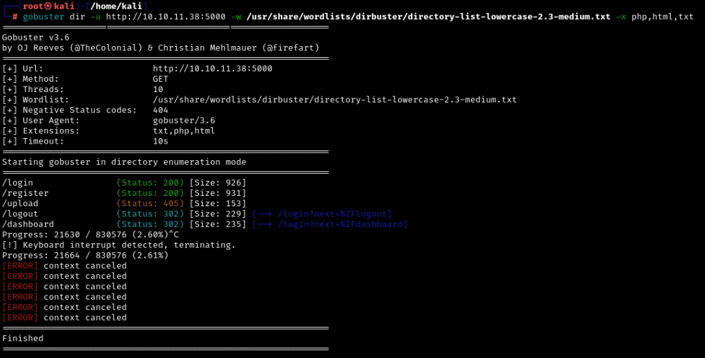 gobuster dir -u http://10.10.11.38:5000 -w /usr/share/wordlists/dirbuster/directory-list-lowercase-2.3-medium.txt -x php,html,txt