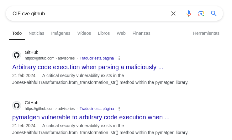 Buscamos en Google si existe alguna vulnerabilidad potencial o CVE para archivos CIF.