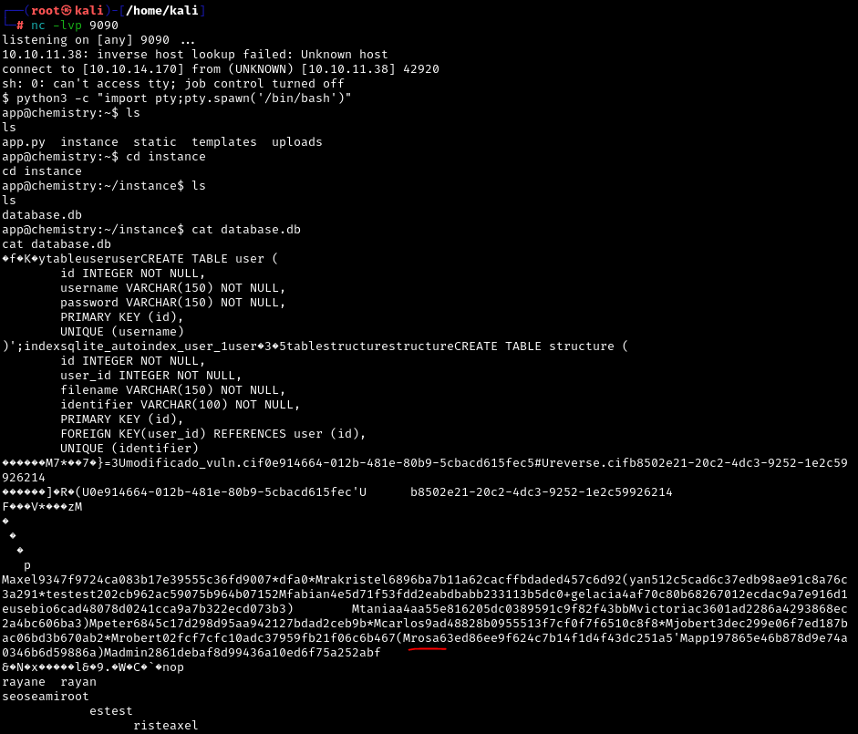 Después de listar los distintos archivos y navegando por la terminal, acabamos encontrando el archivo database.db que contiene usuarios y contraseñas, encontrando el usuario «rosa» y una contraseña en formato hash.