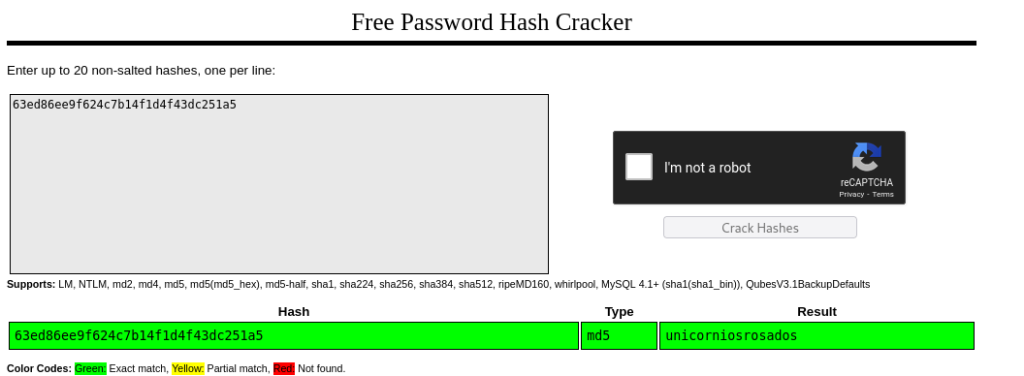 Por lo que vamos a crackear esa contraseña hasheada a través de la web CrackStation: