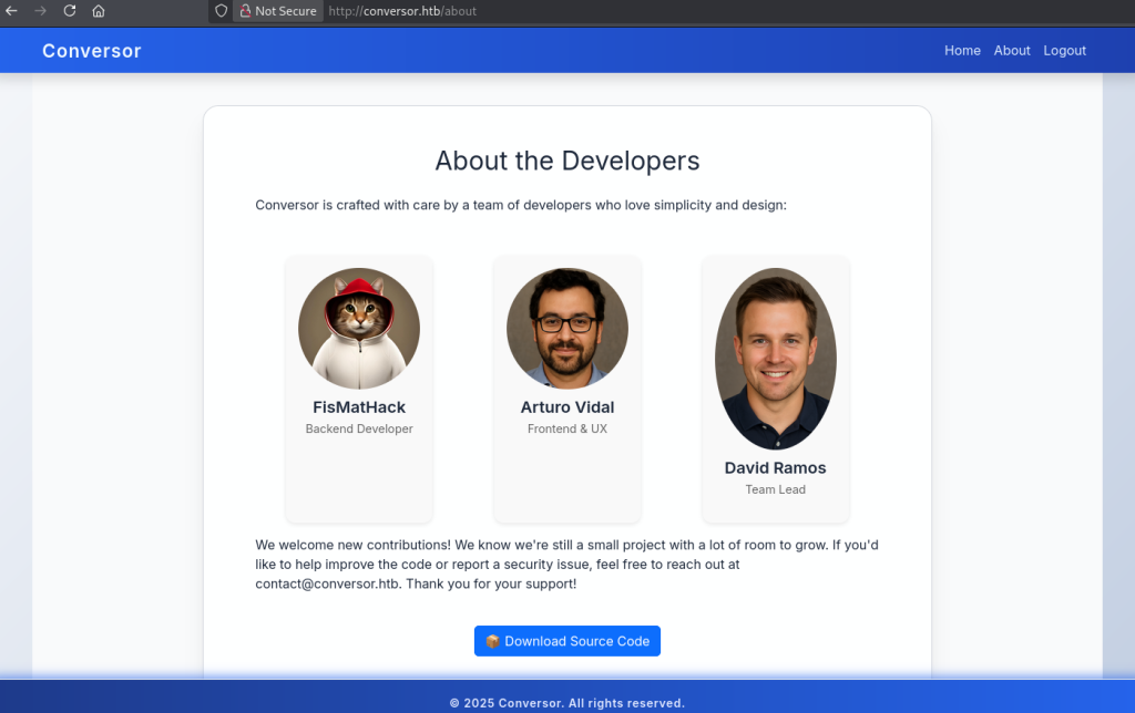 y se detecta de primeras un directorio de /about , que al acceder vemos información acerca del nombre de los desarrolladores (potenciales nombres de usuarios) y un botón de descarga del código fuente de lo que parece ser la aplicación.