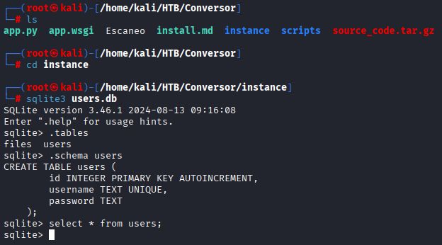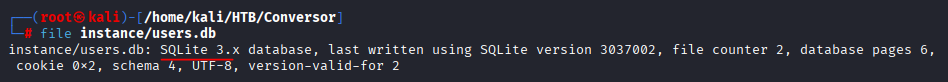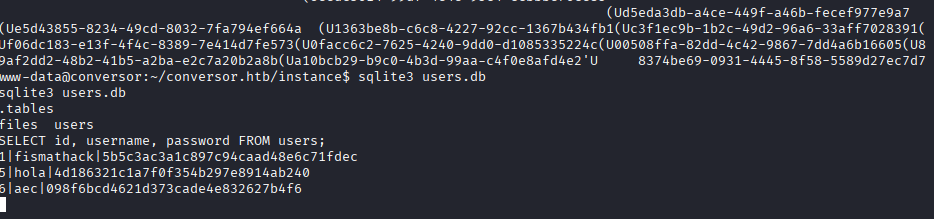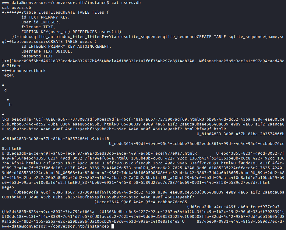 Entonces ahora nos movemos por la carpeta donde www-data tiene permisos que es «conversor.htb», después por instance, y abrimos la BBDD de users.db, y nos encontramos con un fichero ilegible donde probablemente estén usuarios y contraseñas que necesitamos pero que necesitamos formatearlo: