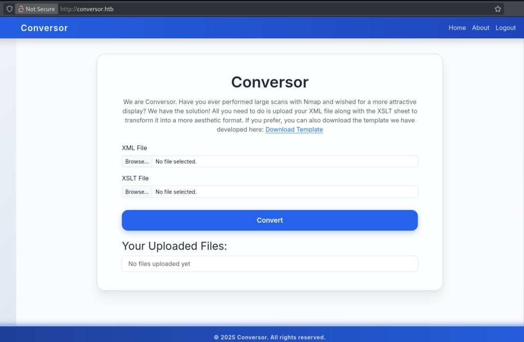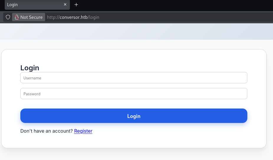 Por tanto, descartamos el 8080, el 22 lo dejamos en stand-by, y pasamos al puerto web 80 modificando el archivo /etc/hosts para hacer una resolución DNS asociado esa IP al nombre de dominio que nos dan conversor.htb .