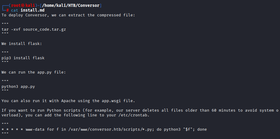 Al ver el interior del fichero install.md vemos la última línea que nos muestra que cada minuto, el usuario del sistema www-data (el mismo que ejecuta el servidor web Apache) ejecutará todos los archivos Python (*.py) que estén en el directorio /var/www/conversor.htb/scripts/.