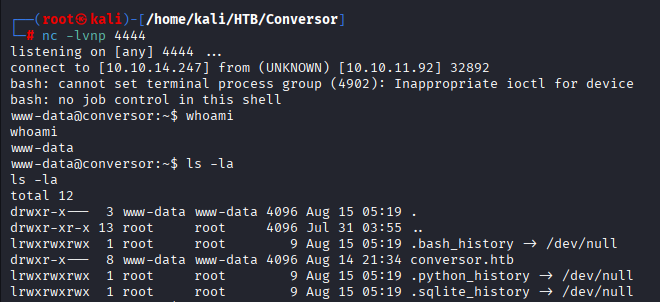 Si subimos ambos ficheros, y nos ponemos en escucha en nuestra máquina por el mismo puerto 4444 tenemos conexión con la máquina atacante pasados un minuto del cron, y somos el usuario www-data.