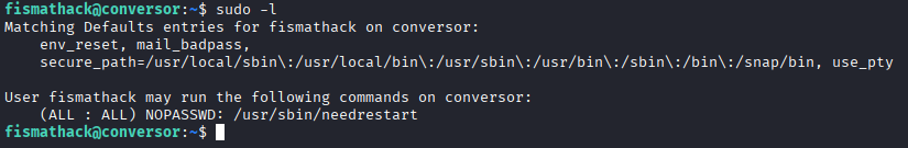 Esto nos dice que el usuario fismathack puede ejecutar este binario /usr/sbin/needrestart como root y sin contraseña.