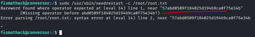Aunque needrestart ha devuelto un mensaje de error de parsing (porque no esperaba un archivo .txt como entrada), sí que ha intentado procesar el contenido del archivo /root/root.txt.