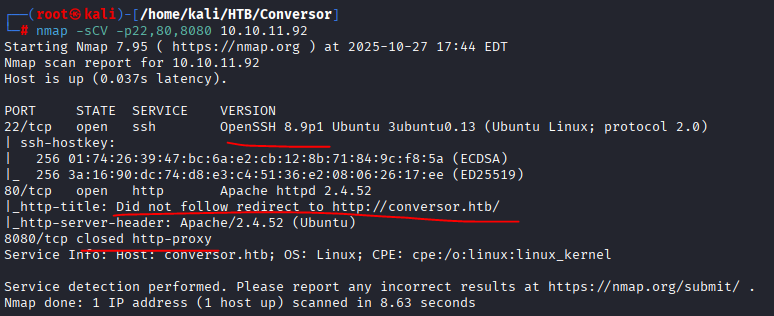 Si ahora hacemos un escaneo con nmap para ver qué servicios y versiones corren para esos puertos abiertos, vemos que el 8080 está cerrado (¿un falso positivo?), el 22 es un OpenSSH 8.9p1 (a priori no vulnerable), y el puerto 80 hace una redirección al dominio conversor.htb pero no resuelve.