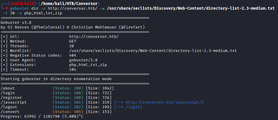 gobuster dir -u http://conversor.htb/ -w /usr/share/seclists/Discovery/Web-Content/directory-list-2.3-medium.txt -t 30 -x php,html,txt,zip