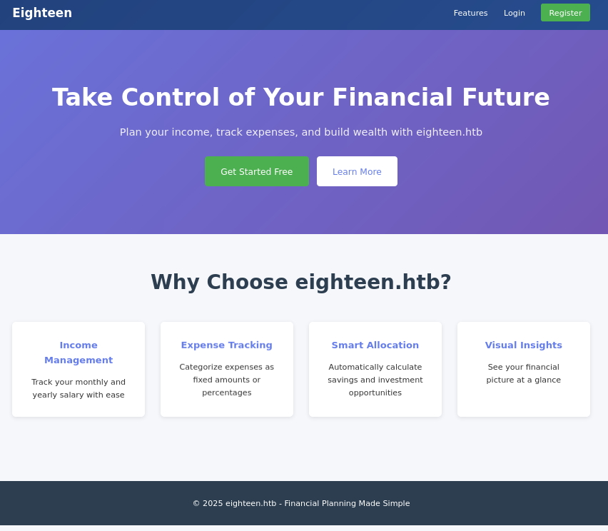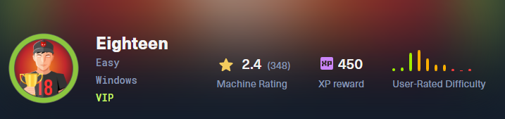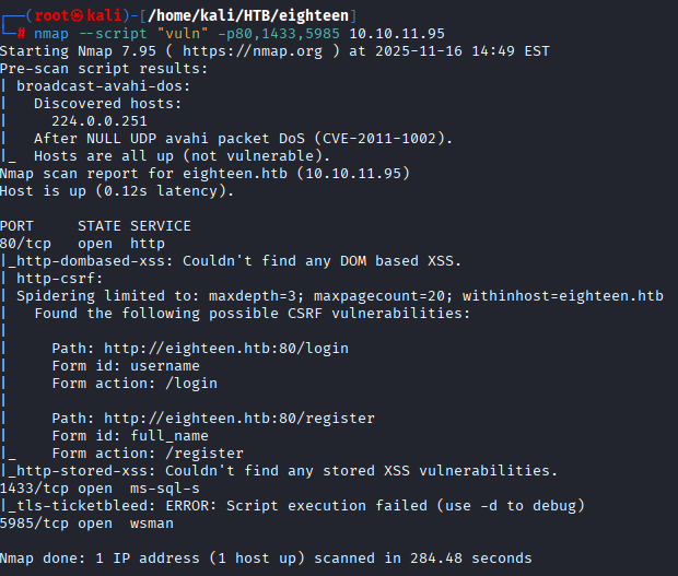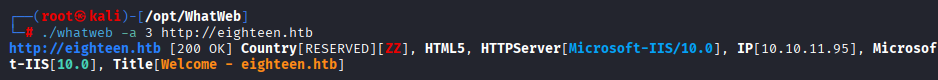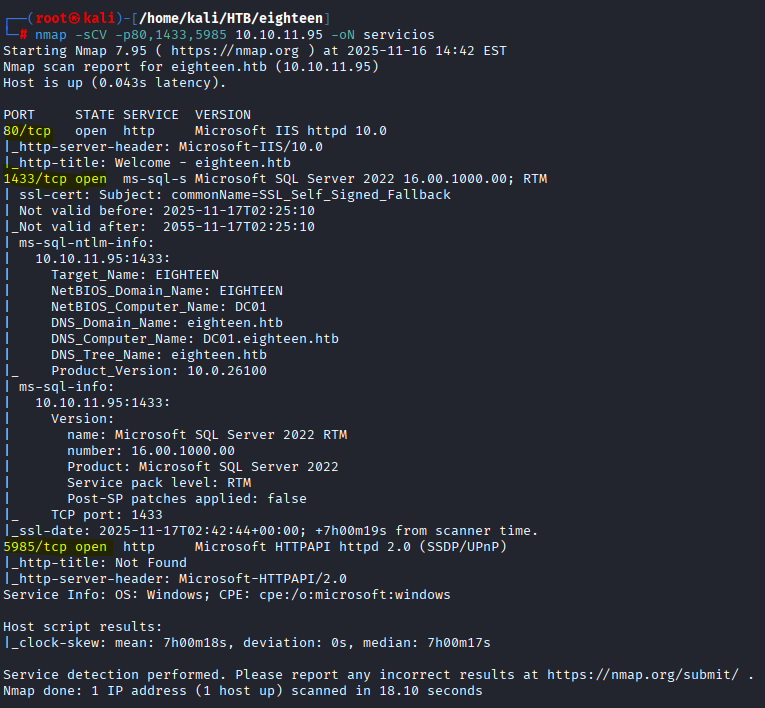 Vemos que el 80 no sigue una redirección al dominio http://eighteen.htb/ por lo que tendremos que asociar la IP a ese dominio para aplicar resolución DNS (lo haremos a través del fichero /etc/hosts), y los otros puertos nos devuelven un estado filtered el 1433 donde nmap no sabe si en realidad está abierto o no porque algo puede estar filtrando la conexión como por ejemplo un firewall (el de la bbdd de Microsoft que solo puede estar abierto en interno y no externamente) y open el 5985 (WinRM Windows Remote Management, que permite conexión remota por PowerShell -como un SSH de Windows).