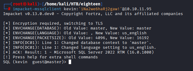 impacket-mssqlclient kevin:'iNa2we6haRj2gaw!'@10.10.11.95