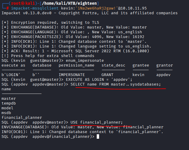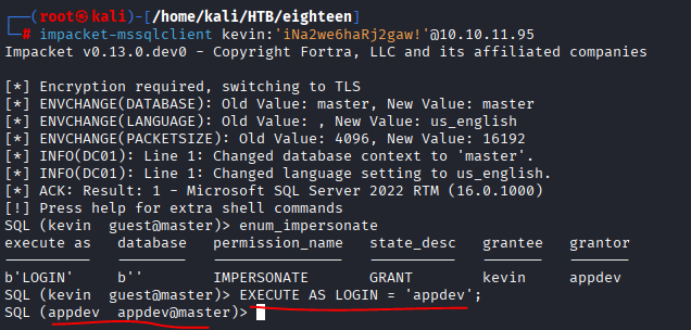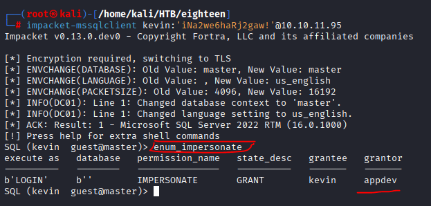 Esto significa que la cuenta SQL de Kevin tiene privilegio para impersonar al login appdev. En SQL Server, impersonate es potente: permite asumir el rol de otro usuario de base de datos, potencialmente con más privilegios.