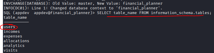 SELECT name FROM master..sysdatabases;). Identificamos una BD interesante llamada financial_planner, que coincide con la temática de la web. - Usar la base de datos financial_planner: Cambiamos a esta base de datos: