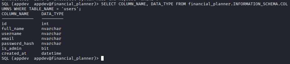 SELECT username, email, password_hash FROM financial_planner.dbo.users;