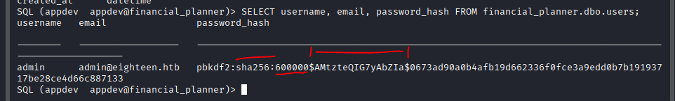 Vemos que las contraseñas están almacenadas con un algoritmo PBKDF2-HMAC-SHA256 con 600,000 iteraciones. Es un hashing robusto, pero si la contraseña subyacente es débil, podemos intentar romperlo con fuerza bruta.