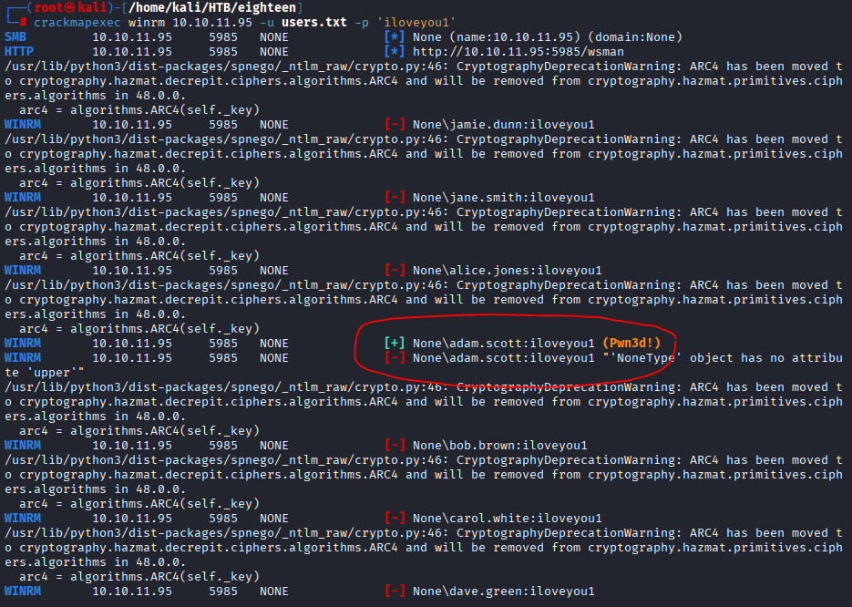 crackmapexec winrm 10.10.11.95 -u users.txt -p 'iloveyou1'