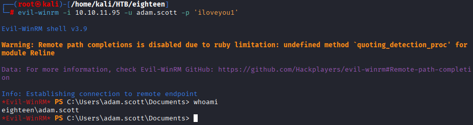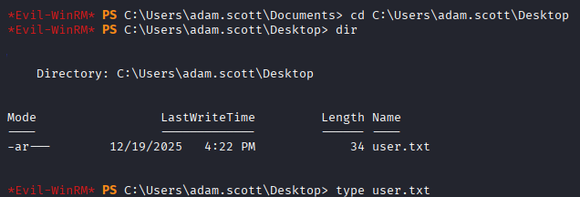 Con las credenciales de adam.scott, procedemos a obtener una shell en la máquina víctima. El servicio WinRM abierto nos permite usar Evil-WinRM, una herramienta para obtener una sesión PowerShell interactiva: