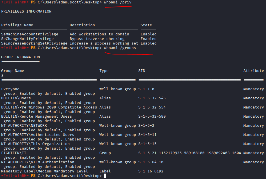 whoami /privywhoami /groupspara ver si adam.scott tiene privilegios especiales a nivel del host. No observamos nada como SeBackupPrivilege habilitado (técnicas comunes de escalada en Windows), ni pertenecía al grupo local Administrators. Así que no parece tener privilegios elevados locales directos.