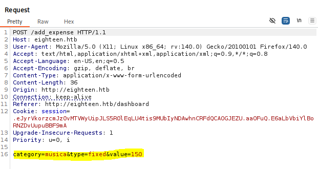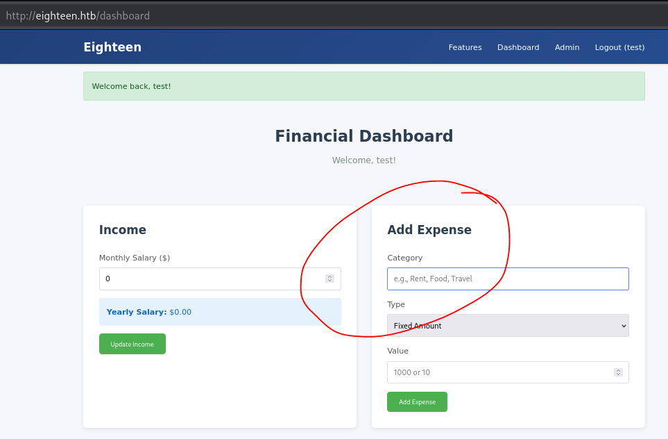 Dentro del dashboard de la app como el usuario test, lo que hago es registrar los campos de Add Expense y capturar el envío al servidor a través de BurpSuite y manipular la respuesta.