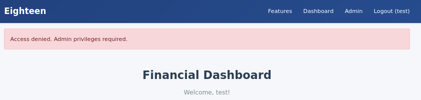 Interactuando con la aplicación web, al crearme una cuenta y entrar en el panel de usuario, se muestra una opción en el menú que pone Admin … sin embargo si intentamos acceder a la ruta /admin , nos da este error…