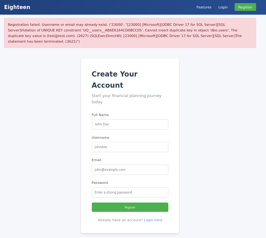 CURIOSO: me caducó la sesión que había creado antes y tuve que crearme un nuevo usuario en el registro. Sin embargo, en lugar de crear un nuevo usuario, creé el mismo que había registrado antes, y al ser el mismo, la aplicación me dio un error con este aviso: