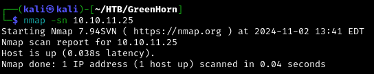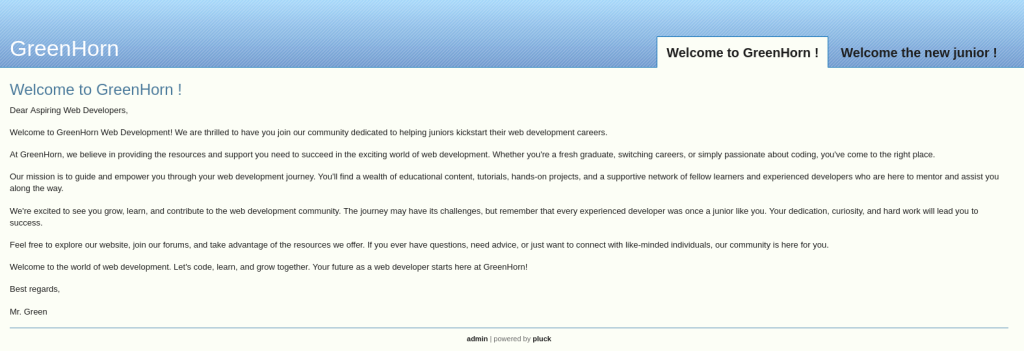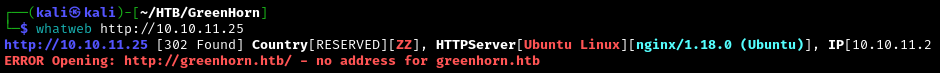 De tal forma que, ahora, si incluyes el dominio greenhorn.htb en el navegador, este te da una respuesta 200 y te sirve una página: