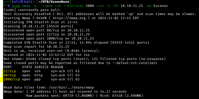 Después el escaneo me devuelve que los puertos 22 ssh, 80 http y 3000 ppp están abiertos.