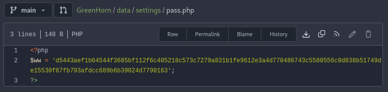 Exploramos todos y vemos que en data – settings – hay un archivo llamado pass.php que contiene una credencial: