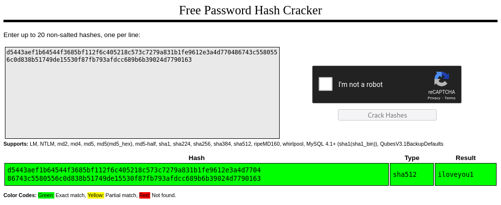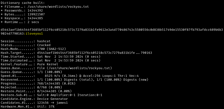 hashcat -m 1700 -a 0 hash.txt /usr/share/wordlists/rockyou.txt