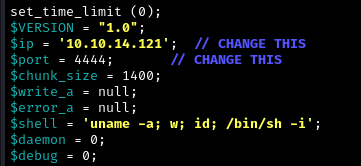 El nombre del fichero será reverse-shell.php y contendrá el php descargado anteriormente junto con las modificaciones de IP y puerto de escucha.