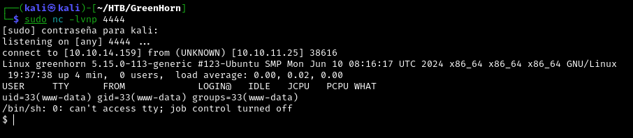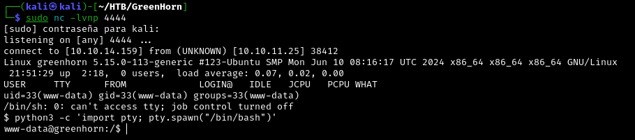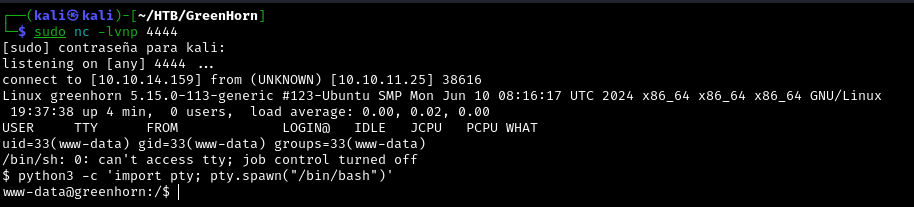 Una vez hemos accedido, vamos a configurar el entorno de la terminal para hacerlo más estable y funcional dentro de la reverse shell de esta forma: