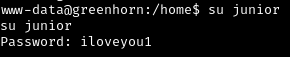 Si nos movemos al directorio home vemos un usuario «junior» y otro archivo git. Intentamos acceder al usuario junior como sudoers y le incluimos la contraseña iloveyou1, y accedemos: