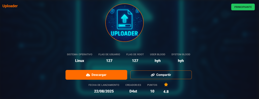 La máquina se llama Uploader y tiene una dificultad de Principiante y se encuentra dentro de la categoría de Hacking Web.