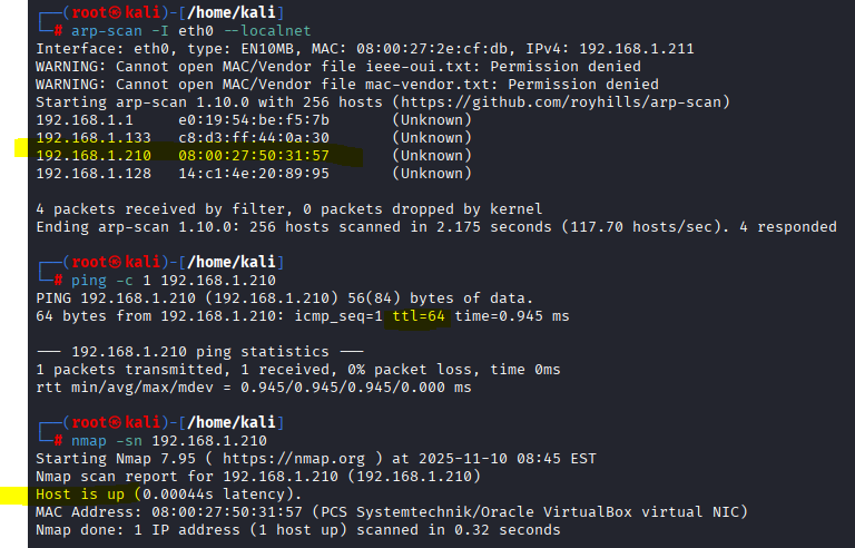 Vemos que la IP «is up» está activa y su ttl es de 64, es decir, SO Linux.