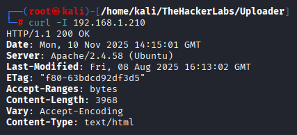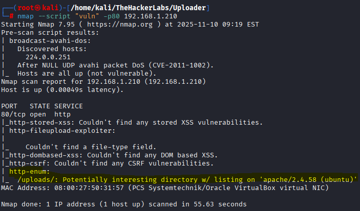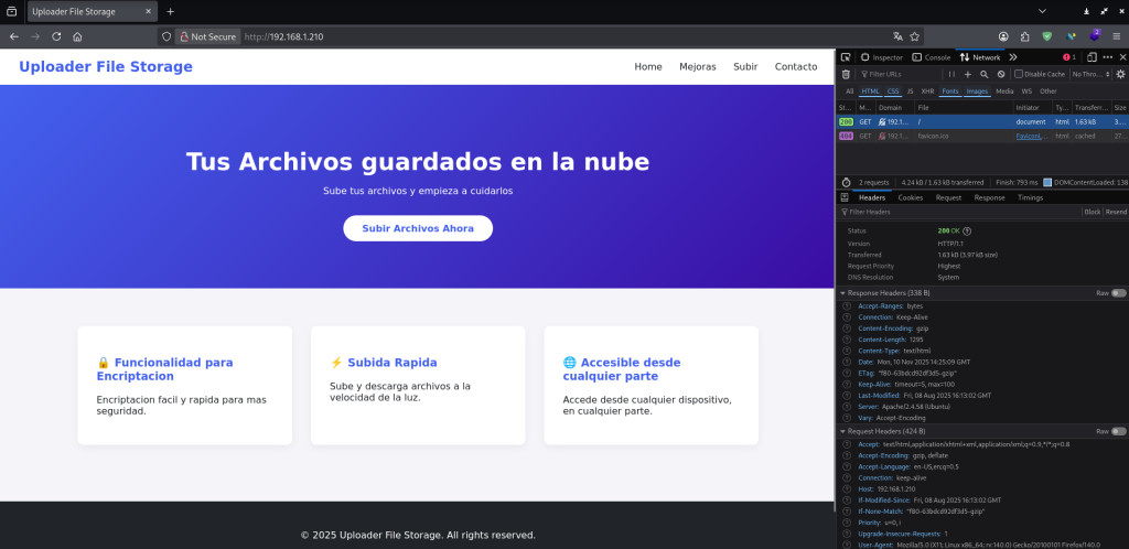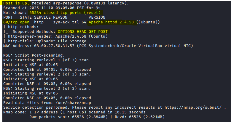 El escaneo de puertos, servicios y versiones nos dice que de los 65.535 puertos TCP que hay en total, solo responde como «open» o abierto, uno, que es el puerto 80 web y que corre bajo servidor Apache versión 2.4.58 y que soporta en la cabecera de respuesta http la opción POST de envío o subida de datos (muy en línea con el nombre de la máquina UPLOADER XD).