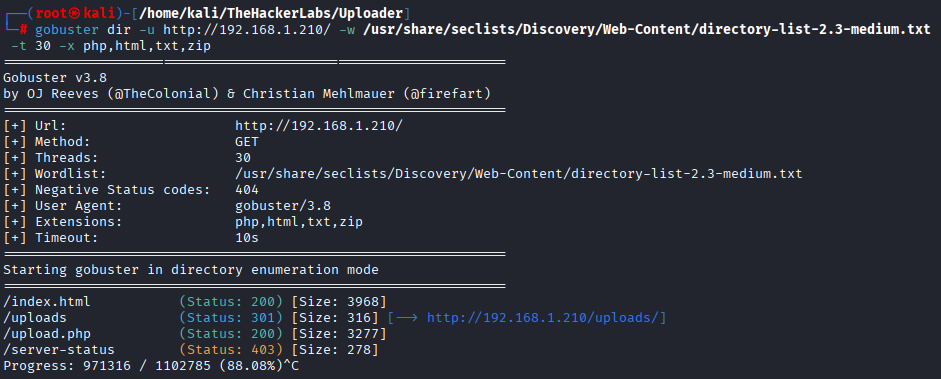 Vamos a hacer un análisis algo más profundo para detectar (si es que existen) directorios, subdominios o ficheros ocultos….ya de primeras, y como nos anticipaba el reconocimiento vuln de nmap, existe un directorio /uploads y fichero «upload.php» pero queremos ver si hay algo más de información.