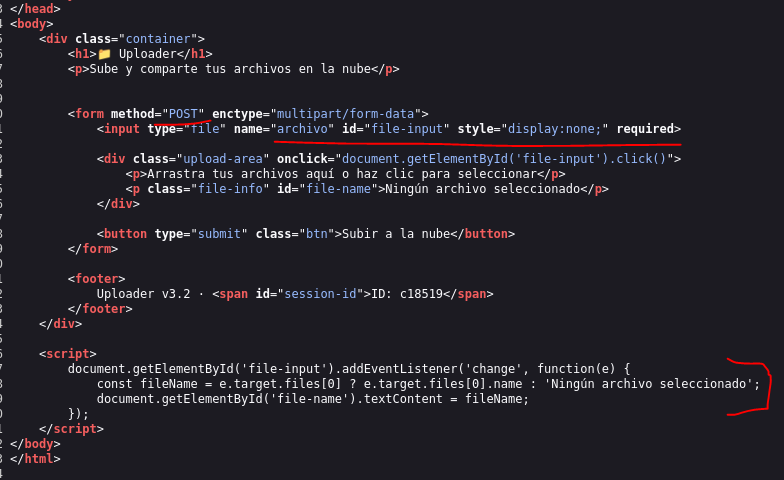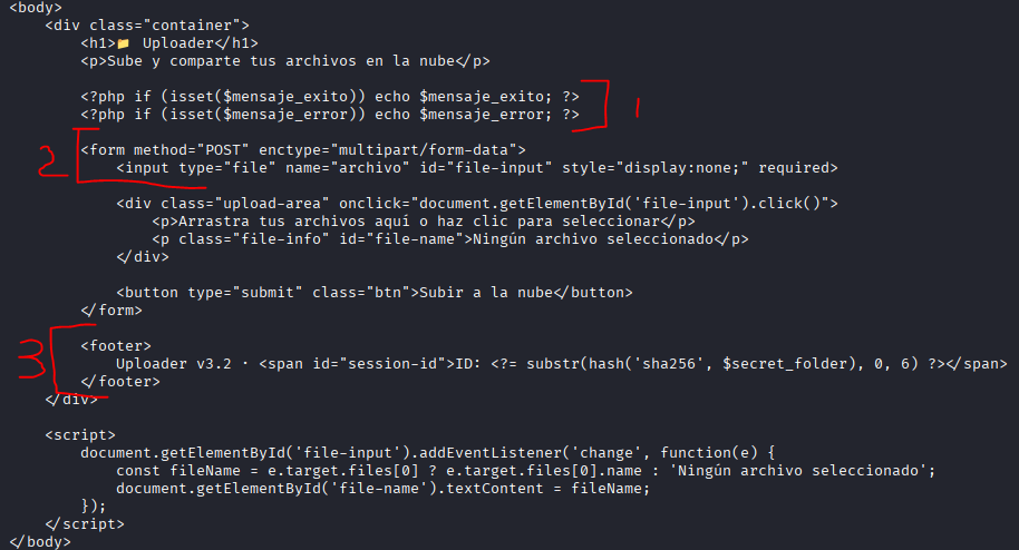 - No usan htmlspecialchars() ni similar. Si alguno de esos mensajes incluye datos derivados del nombre del archivo o de otra entrada de usuario, podríamos inyectar HTML/JS y tener un XSS reflejado. No es lo que hemos usado para la reverse shell, pero es otra debilidad del código.