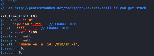 Y ahora modificamos el archivo php con la IP nuestra atacante (eso lo podemos saber usando el comando «ifconfig») y un puerto aleatorio para escuchar con netcat (yo usé el 4444).