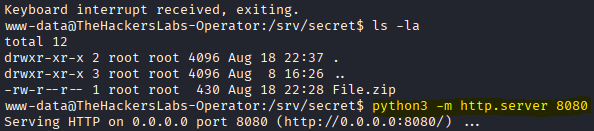 Nos movemos a la carpeta /srv/secret en la máquina víctima que es donde está el fichero .zip , y levantamos el servidor: