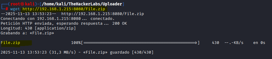 ahora desde nuestra máquina atacante, hacemos la petición por wget, y conseguimos descargarnos el .zip