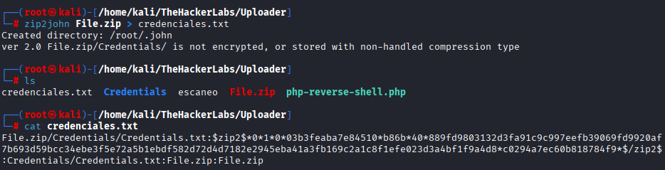 Como es un ZIP protegido, lo que tenemos que hacer es convertir el ZIP a un formato crackeable por JohnTheRipper por ejemplo y lo alojamos en credenciales.txt