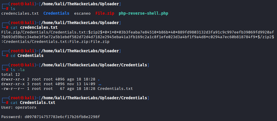 ahora volvemos a descomprimir el File.zip usando «7z x File.zip» y ya obtenemos la password del usuario operatorx: d0970714757783e6cf17b26fb8e2298f