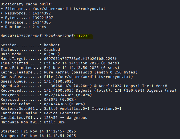 hashcat -m 0 -a 0 hash.txt /usr/share/wordlists/rockyou.txt